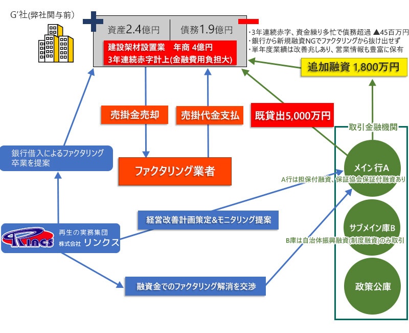 既にメイン行からは「保証協会枠はいっぱいです。社長の自宅も入担済ですが、その他に担保に入れられる不動産でもあれば…」と 言われていましたが、リンクスさんはメイン行との交渉時に「黒字転換を目指しての3か年経営改善計画を2か月で策定し、実行支援と モニタリングを3年間続ける。G'社の経営再建無くしては既存借入金の完済も無い訳ですし、保全を図りながら最小限のリスクでG'社の 経営改善を支援していただきたい」と交渉して下さったのです。 実際にメイン行はこれで心を動かされ信用保証協会付でしたが1,800万円の融資が実行され、弊社はファクタリングから開放されました。 経営改善計画も約束通り取引行3行と保証協会に提出でき、3か月毎に業績報告を続けることになりました。 業績が改善しつつある試算表を持って行くと、サブメイン行が「次回は当行で支援します」と言ってくれたり、創業当時に戻ったようです。